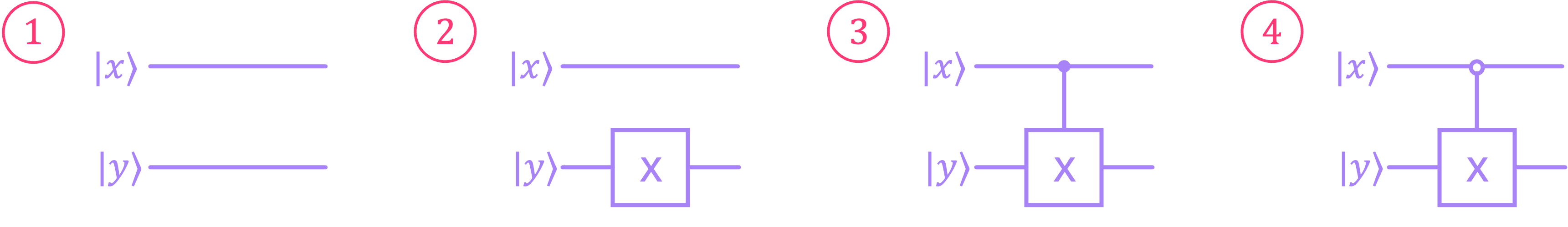 \(f_4(x) = \bar{x}\). The output \(|f(x)\rangle\) is equal to \(|\bar{x}\rangle;\) i.e., the opposite value of the top input.