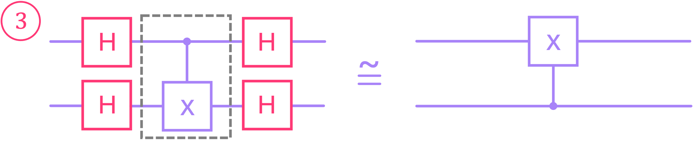 As mentioned before, Deutsch’s problem can be summarized as trying to find if the circuit inside a black box is constant (which results when the top and bottom qubit are independent), or balanced (which occurs when the top qubit can affect the outcome of the bottom qubit). Deutsch’s algorithm exploits the fact that we can effectively construct a quantum circuit around our black box that deterministically changes the output state of the top qubit based on having a controlled gate inside the box. To understand how this is possible, let’s compare circuits 1 and 3, both of which were indistinguishable in our classical approach when the input was \(x = 0\). If we were to add Hadamard gates before and after our black box as follows: