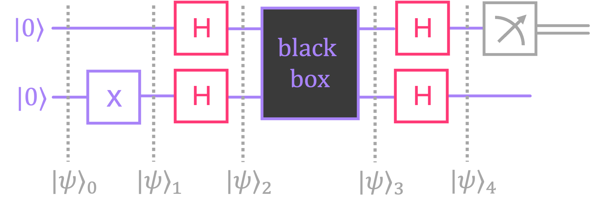 Apply \(X\) gate to bottom qubit \(y\): \(|\psi\rangle_1 = |0\rangle^{\otimes n} \otimes |1\rangle\)