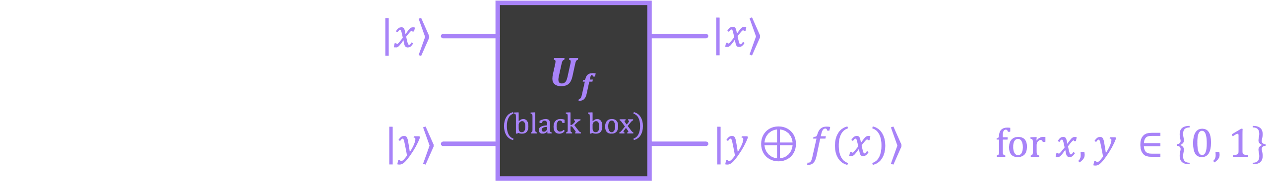A first naïve strategy is to check if there is a combination of classical input values \(x, y \in \{0, 1\}\) that provide different outputs for each of the two types of circuits. Now, since in all four circuits the top output is just a direct copy of a classical input \(|x\rangle\), its value gives us no information about what’s inside the box. We then only need to focus on what happens to the bottom output. Furthermore, given that the objective is to find if we have a box where the top path controls the bottom path (or not), the value that \(y\) takes is irrelevant, so we can set it to \(0\). We can then represent our black-box problem in terms of a single input \(|x\rangle\) and a single output \(|f(x)\rangle\):