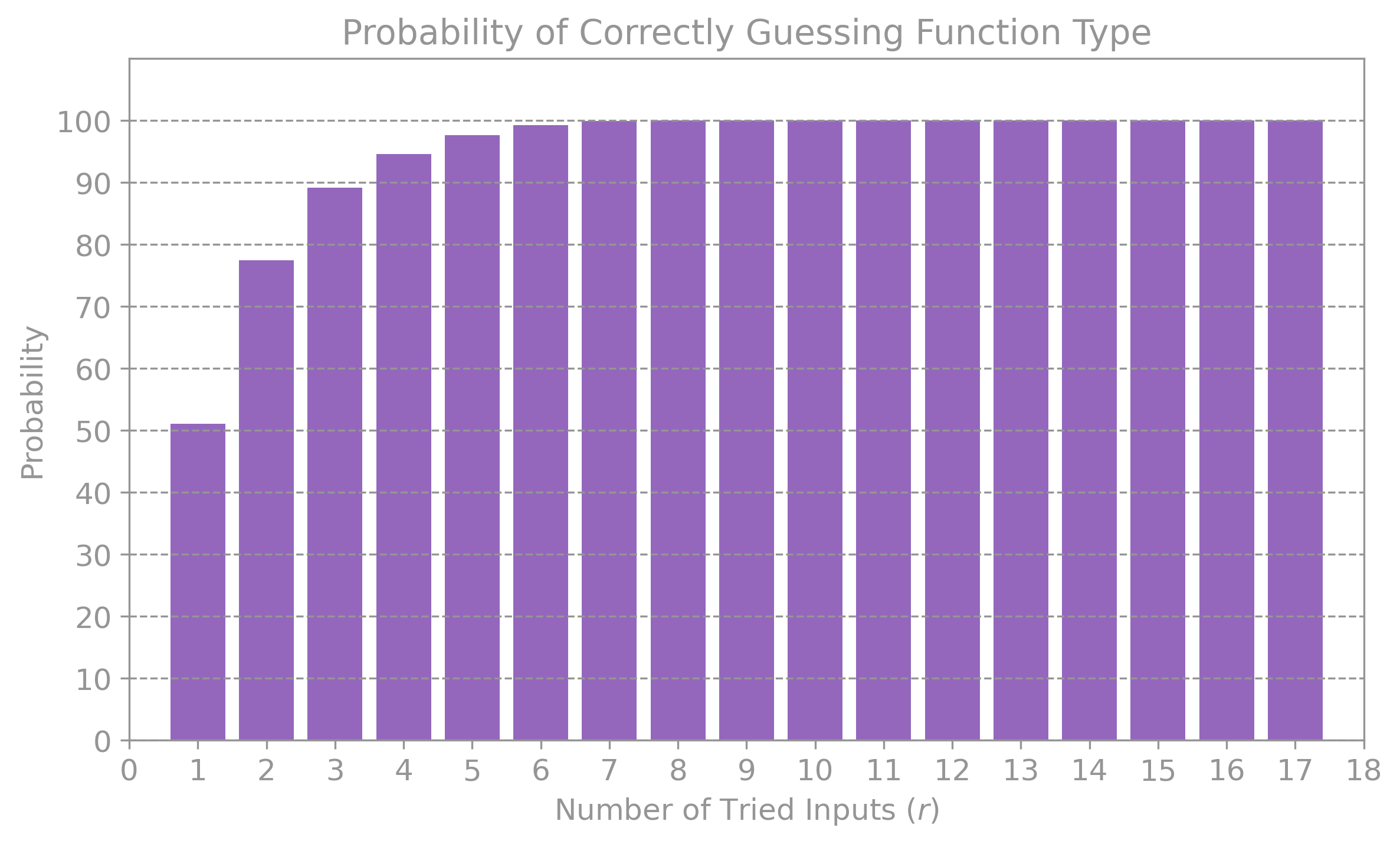 The plot below shows a simulation using a black box that encodes a function with \(32\) possible values of \(x\). It can be seen that the probability of correctly guessing the type of function after trying only \(6\) different inputs is close to \(99 \%\), so we can guess with high probability the function type without having to try all \(\frac{32}{2} + 1 = 17\) different values.